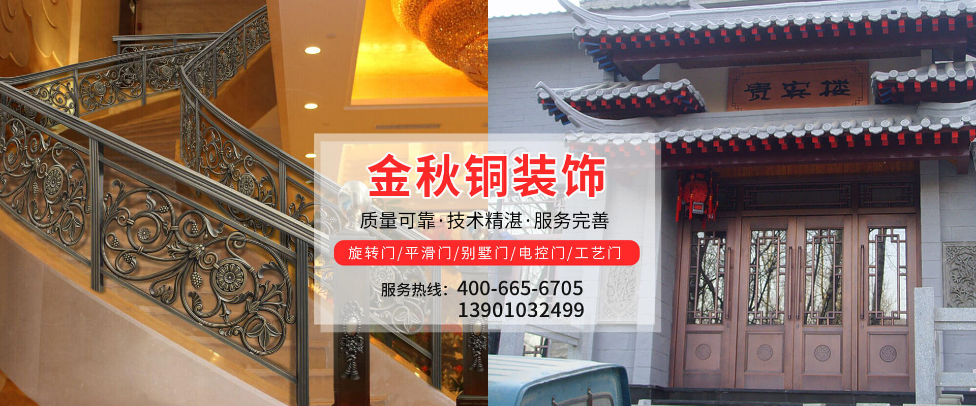 北京金秋銅裝飾材料有限公司是專業生產銅裝飾材料及設計、開發、制造、施工、售后服務為一體的大型綜合企業??沙薪咏ㄖ~裝飾工程及五星級酒店、別墅、博物館、樓樘管所等高檔銅裝飾項目;生產各種規格的旋轉門、平滑門、別墅門、電控門、工藝門、旋轉護欄、屋頂銅飾防水瓦、浮雕壁畫......